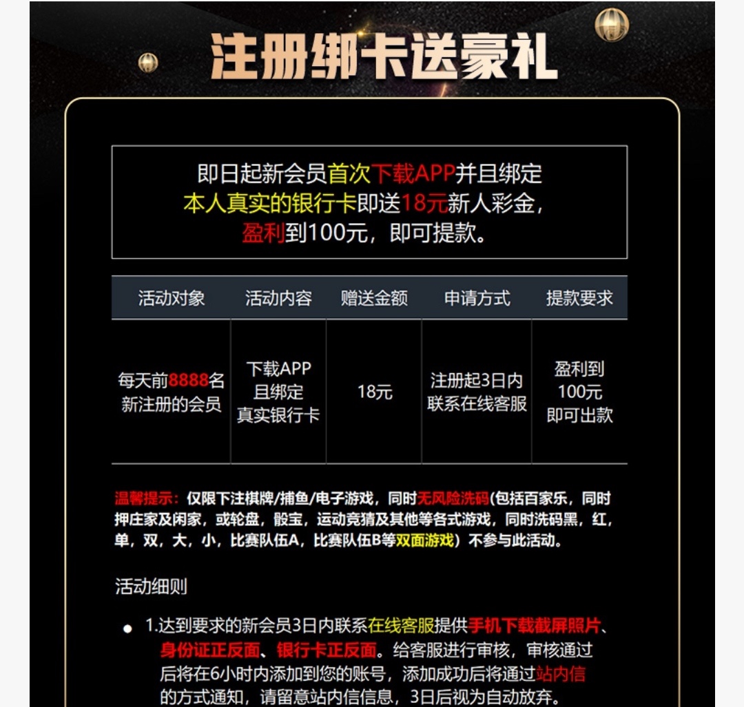 申请彩金要身份证正反面和银行卡照片。
