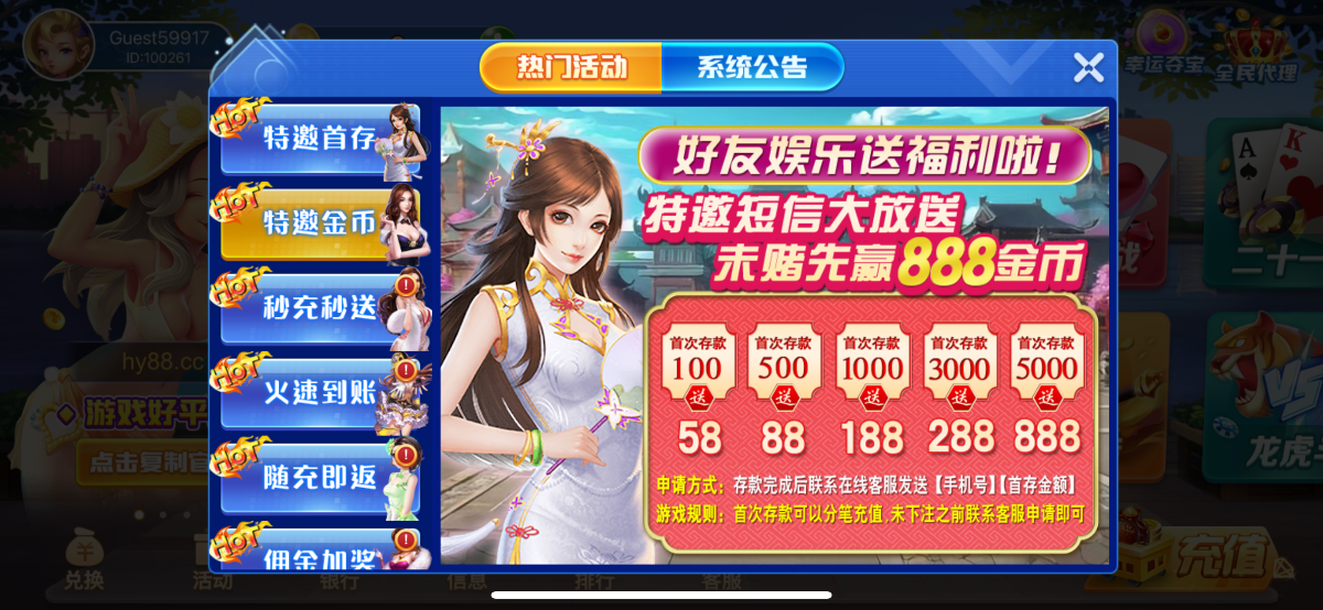特邀用户下载完善资料找客服领36,跟贪玩娱乐是一个模板。基本每个人都送。如果不符合特邀也可以申请注册送18。申请过特邀彩金的,过一段时间去还可以申请,但是不要让客服发现要不然被封号。首存100送58推荐玩财神到2,手机号多的换IP无限撸,