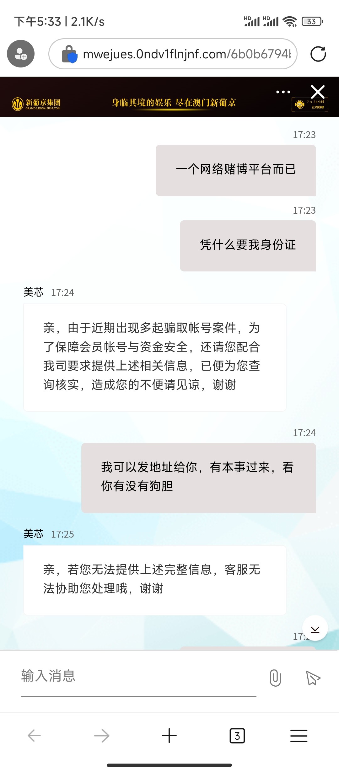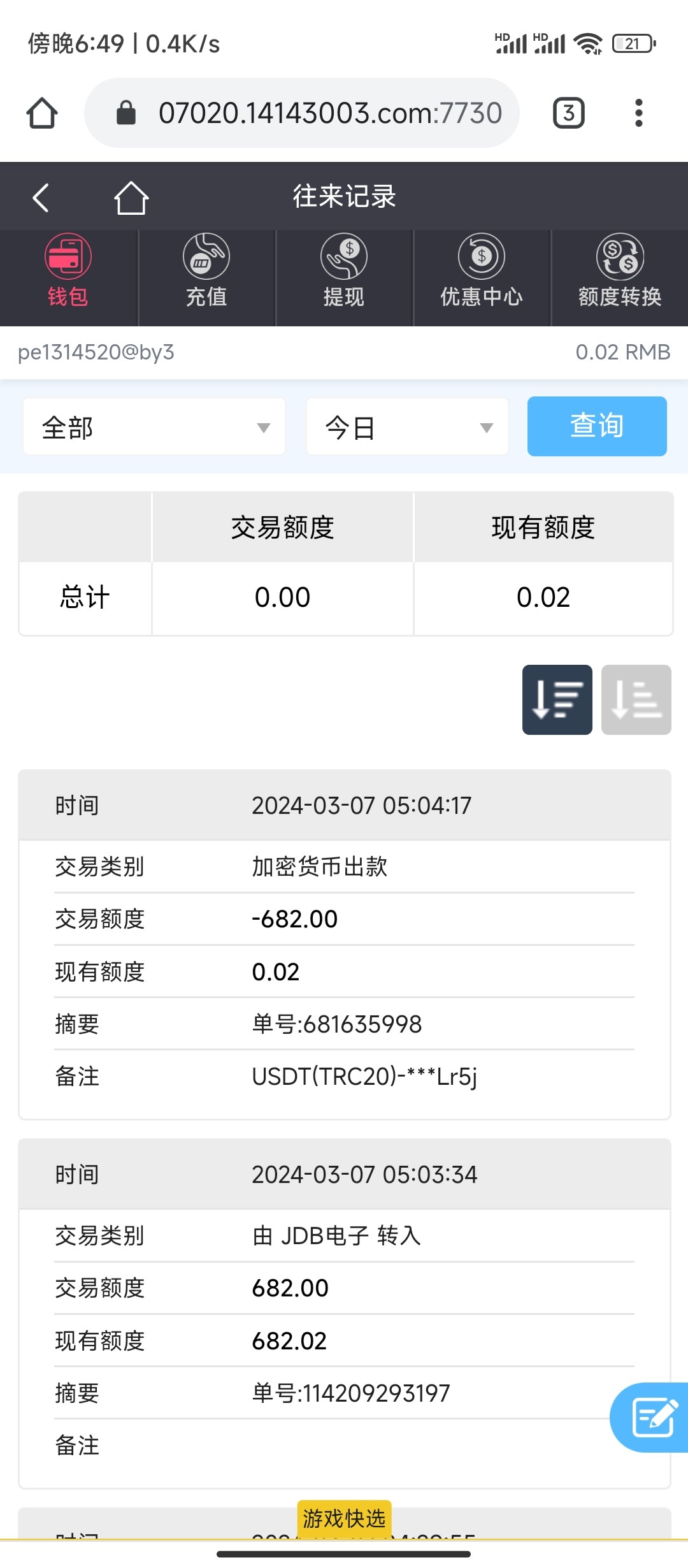 世界之大无奇不有,一般被黑是不给提现要么余额被清除,这次我充值赢了几百还在玩着电子直接弹出账号重复登录,然后我重新输入账号密码显示账号被锁定,我找客服让我提供银行卡号,然后客服直接给我重置密码,新密码一登录还在被锁定,骂了一会客服就想着黑了就黑了,过了一两个小时再登录居然直接登上来了,就是账号钱被绑了USDT转走了,我都没有U,这个狗台子