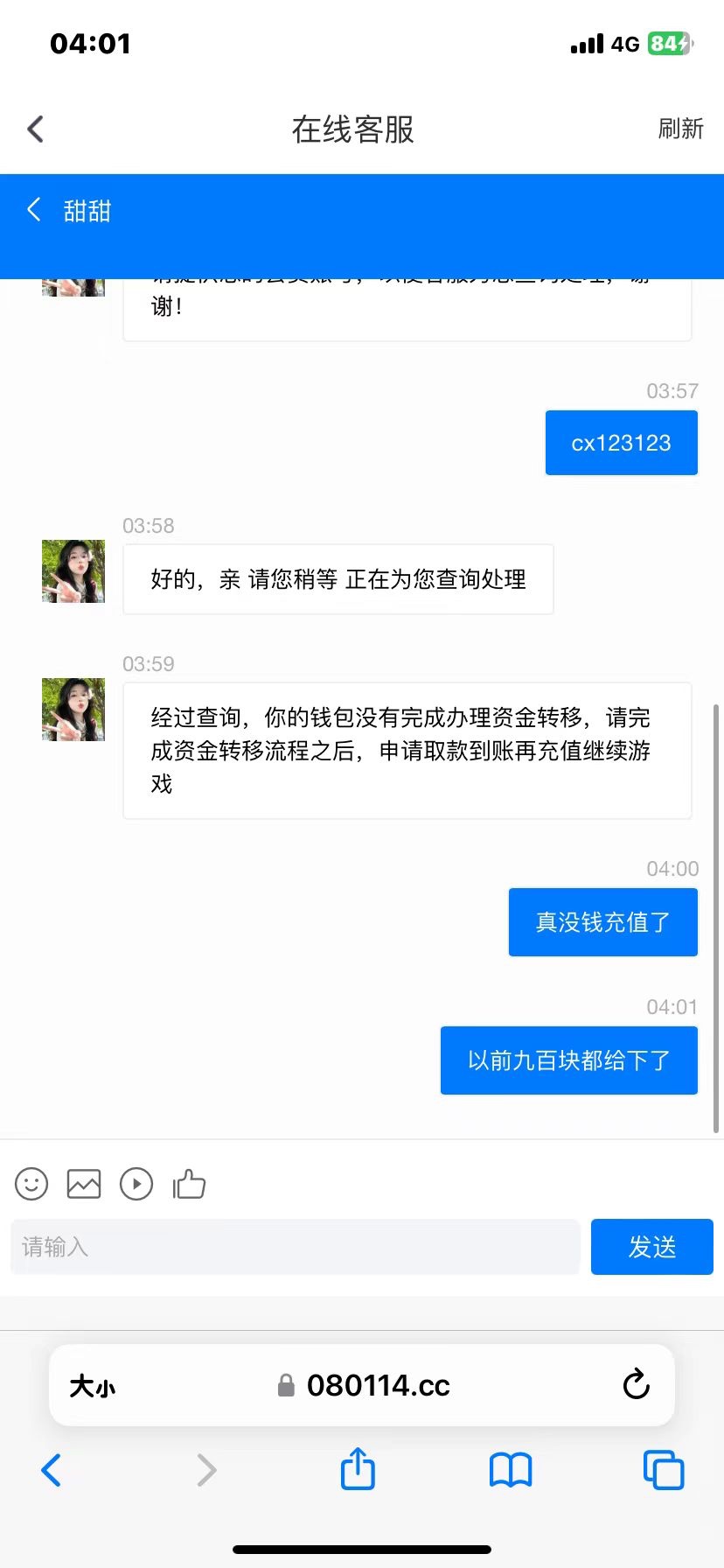 平台老用户几乎天天都在打今天100打到六百下ok币给我说停止合作了叫我用别的币,用别的笔给我说需要匹配叫我买笔充百分之五十我信了想着打了这么久的台子一共就是900块充了就说匹配中叫我等几分钟我就跑去打pg打了一会出来给我说我动了自己匹配失败叫我重新匹配又充百分之五十我就知道黑了下银卡就说通道维护短期不会开通