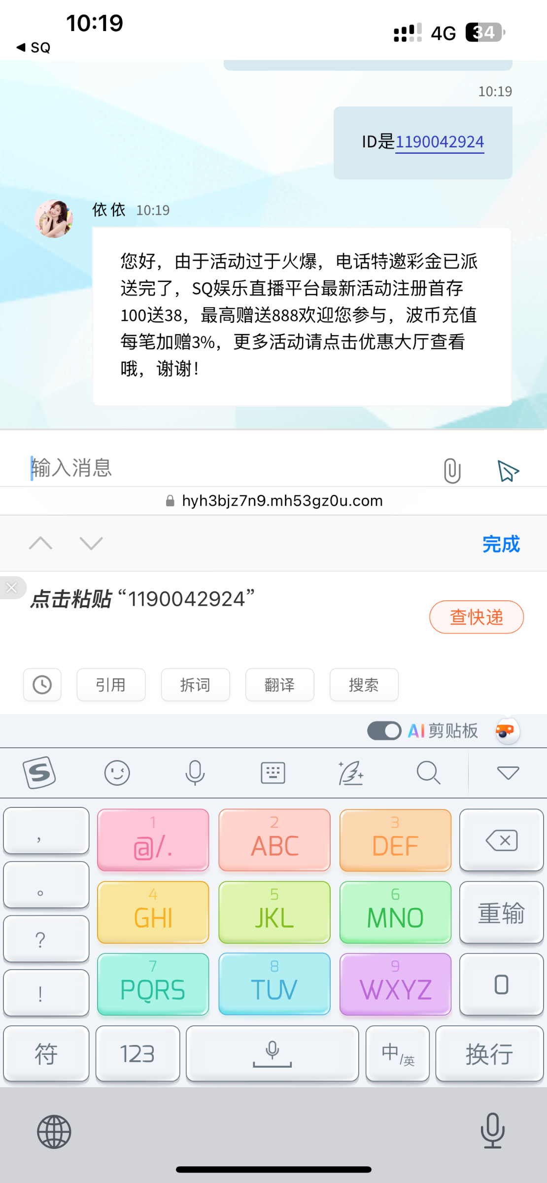 您好,由于活动过于火爆,电话特邀彩金已派送完了,SQ娱乐直播平台最新活动注册首存100送38,最高赠送888欢迎您参与,波币充值每笔加赠3%,更多活动请点击优惠大厅查看哦,谢谢!