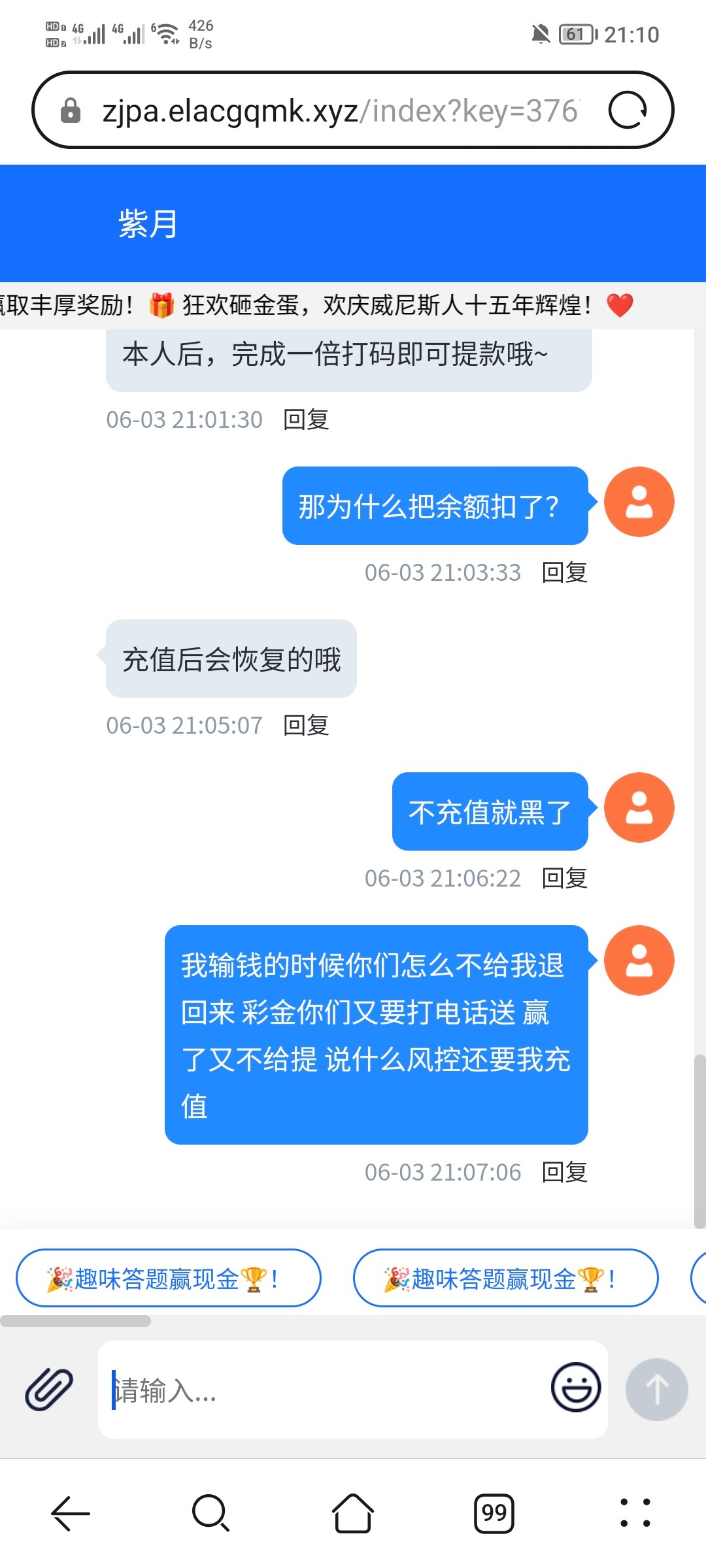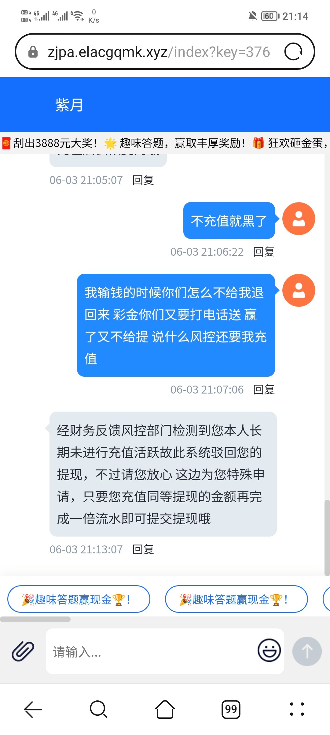 四月份充值过两百 然后中间一直打电话送彩金 今天送了18.88打到了一千不让提 各种话术还给我直接扣除了 黑比台子 老哥们避坑