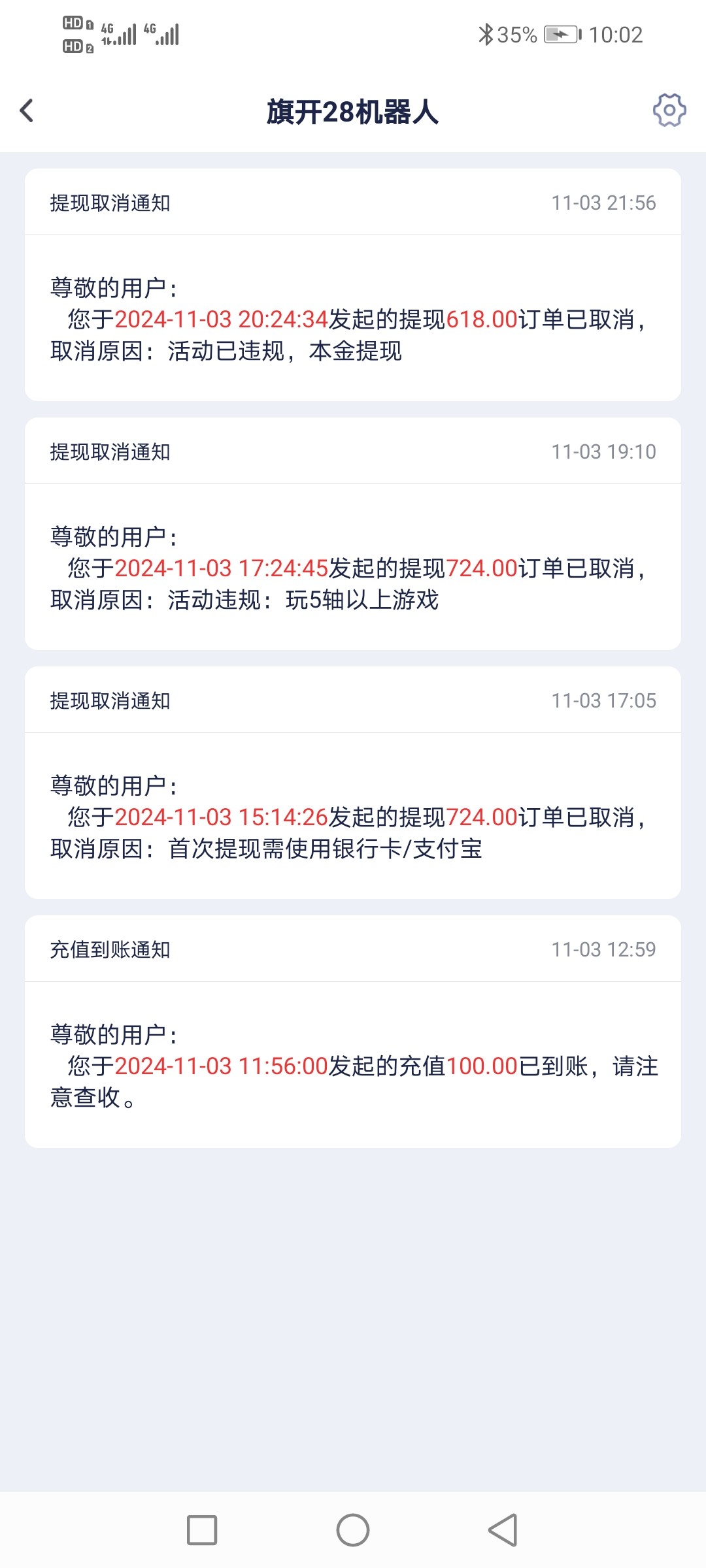 100加100提现说违规退回本金 然后本金100打到600提现又说违规 老哥网推的台子