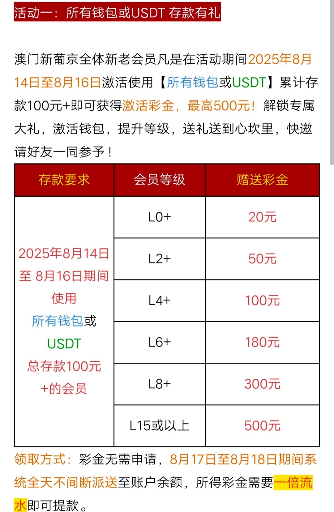 回馈活动,高等级的建议VIP4以上的老哥去搞一下,不想玩可以搞个台子对刷一下,17号就能白嫖了,再对刷一倍流水就能出款了,没兴趣可以忽略。