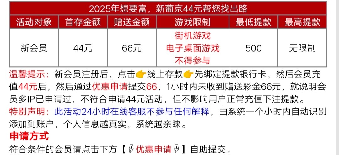 新会员注册下载,绑定提款银行卡电子钱包,首存44元活动区自助申请66元,可以玩真人百家乐,最低500起提,具体规则看活动介绍。