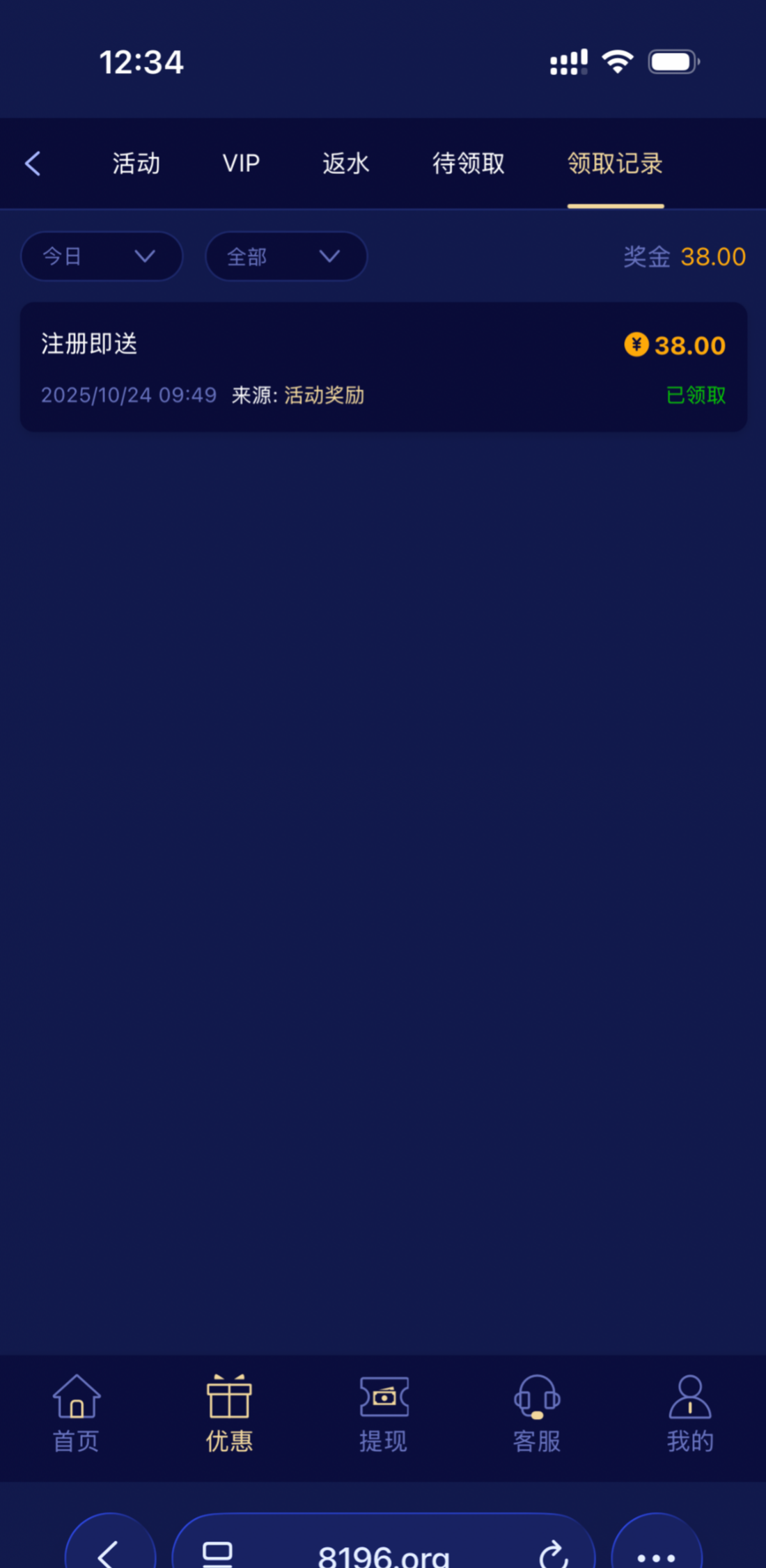 这个之前给我转过一次,注册了打不开客服,昨天又给我转了一次,挂了个VPN客服进去了,送了38提款已到链接8196wg.cc