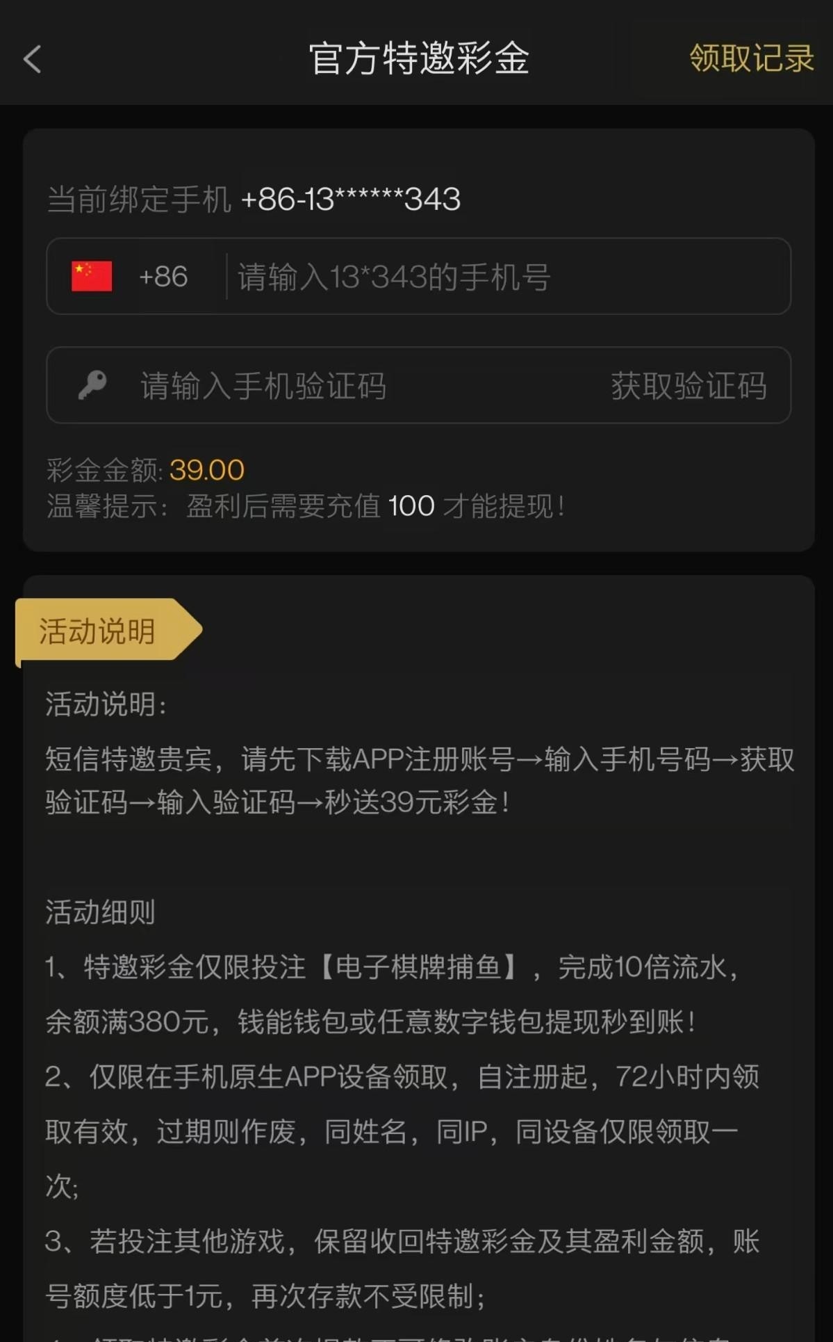 注册绑号码7,特邀还送35 建议先领7去打完在试试特邀,领了特邀要存了才能提注册具体看图