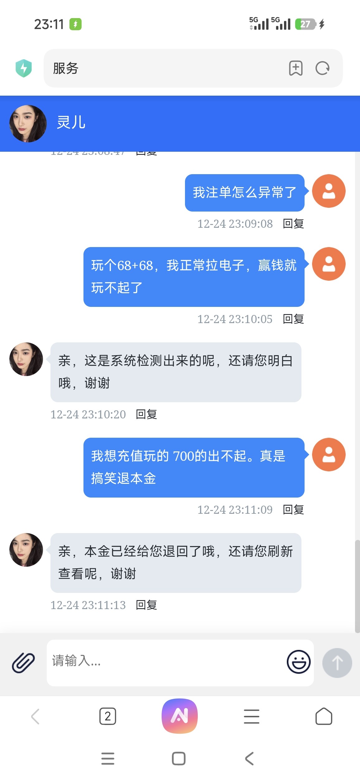 发短信申请27注册彩金没申请到,就首存个68+68赢了700提现,最后只退本。真的有点好笑,以为能吃肉了,结果毛都没有