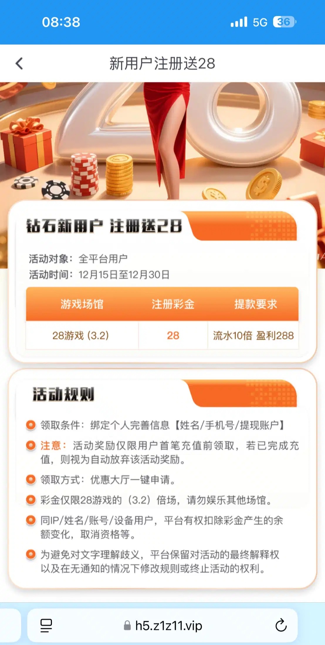 链接zsyule.com 我是之前就注册过了但是没有充值过。然后就发短信过来。领了28只能打3.2的 要打到288才能提  我没有打出来,你们去试一下。没有收到短信的也有新用户送28也是一样的。