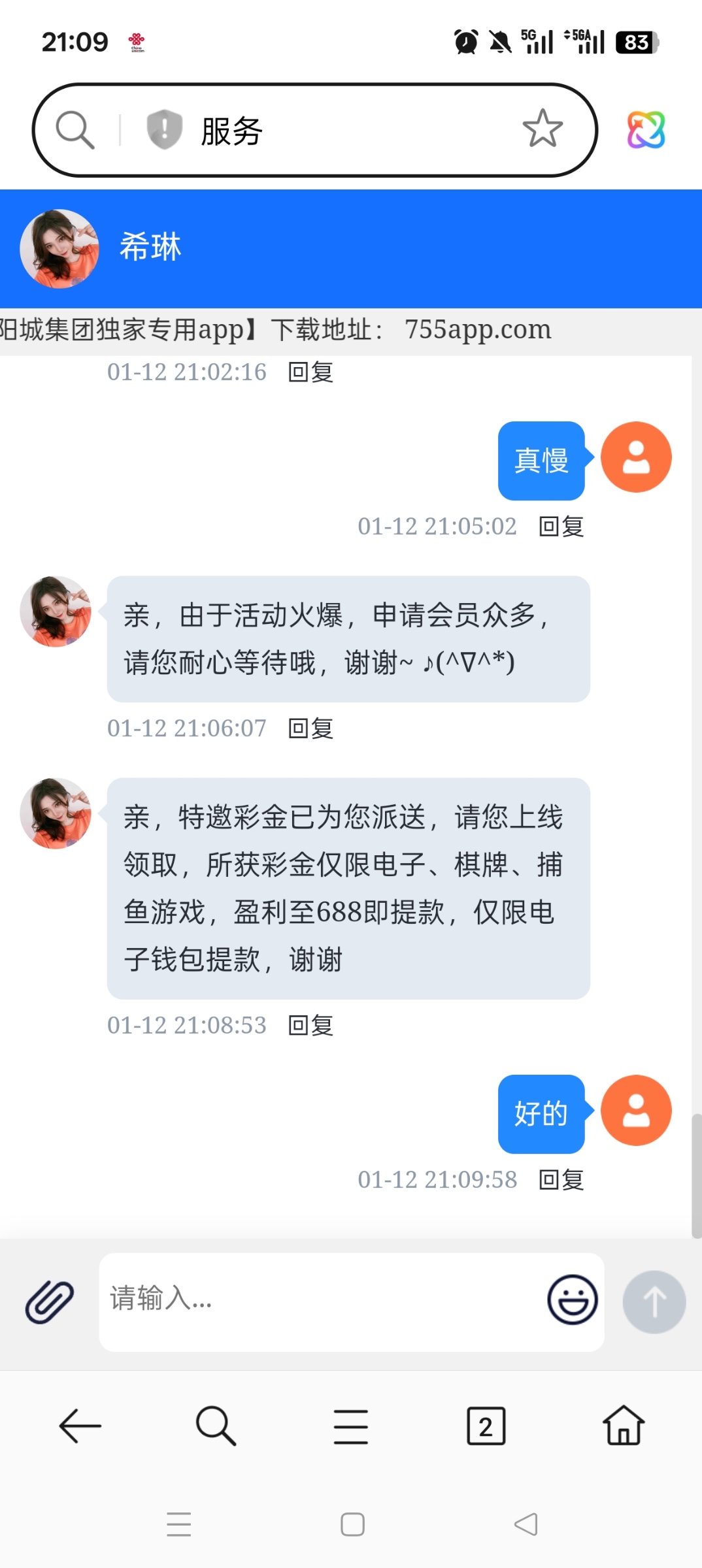 接到机器人电话说我账号很久没登录了,然后发现没注册,注册好了中出客服给了88,没打出来。