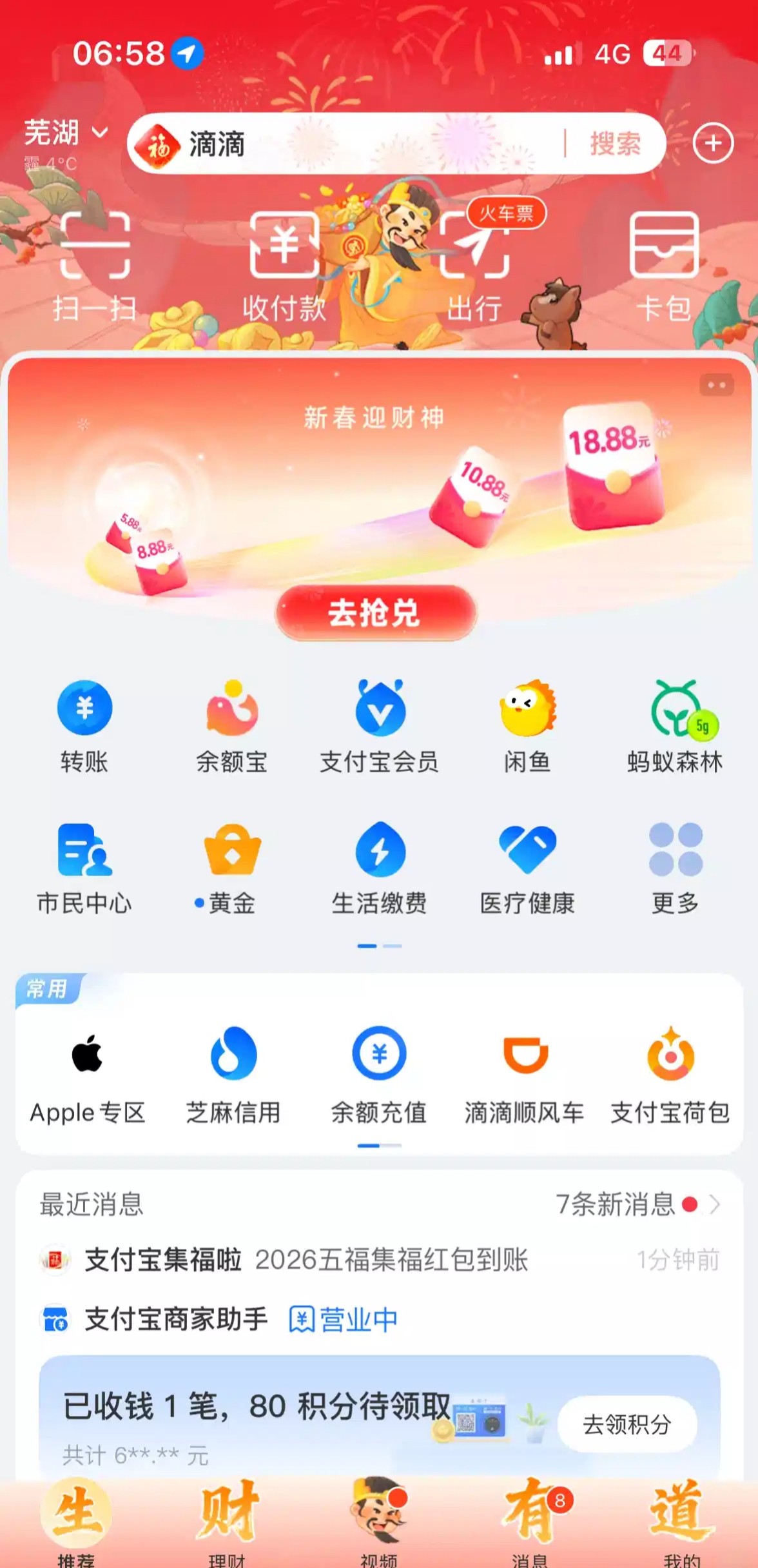 首页点新春迎财神进去,直接就可以提现到余额,之前弄过的集过福卡的,应该都可以领取