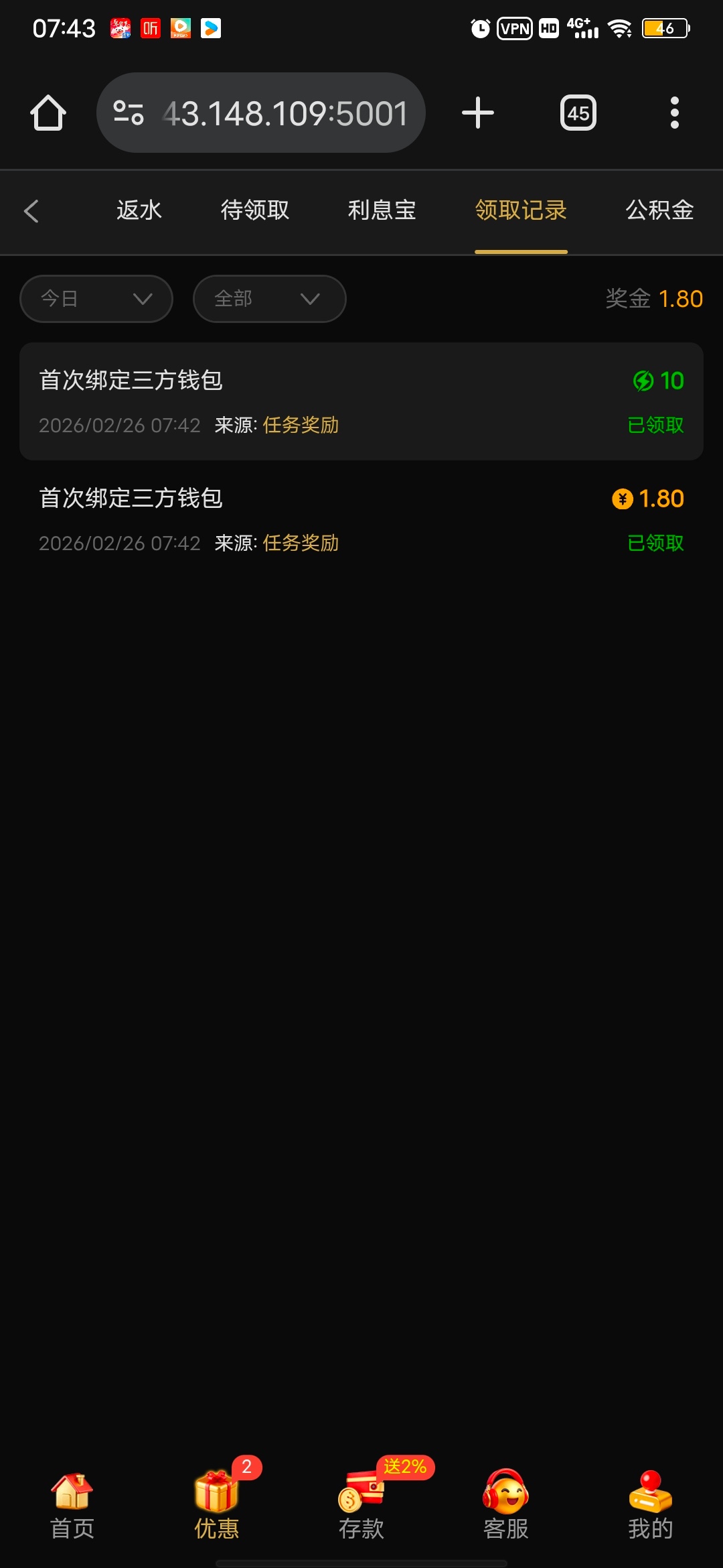 依旧赌神彩没充值过绑定钱包就能领,小几块钱,手法=提现