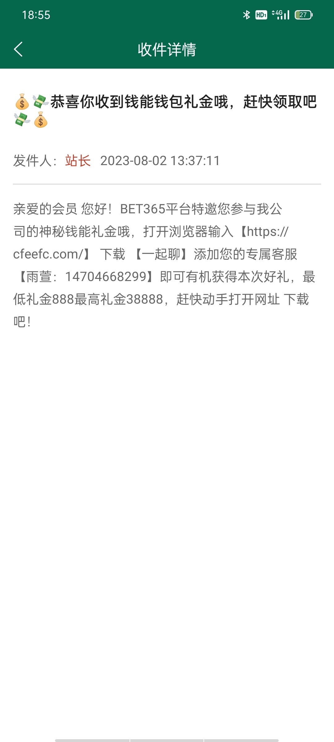老用户看一下站内信有没有类似这种送彩金的,下面这个最低送888
